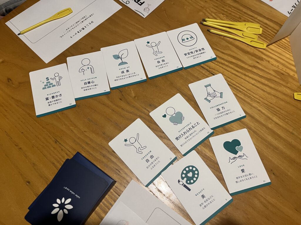 価値観が書かれた52枚のカードの中から、自分が大事だと思うものを手元に「5枚だけ」残すというゲームです。